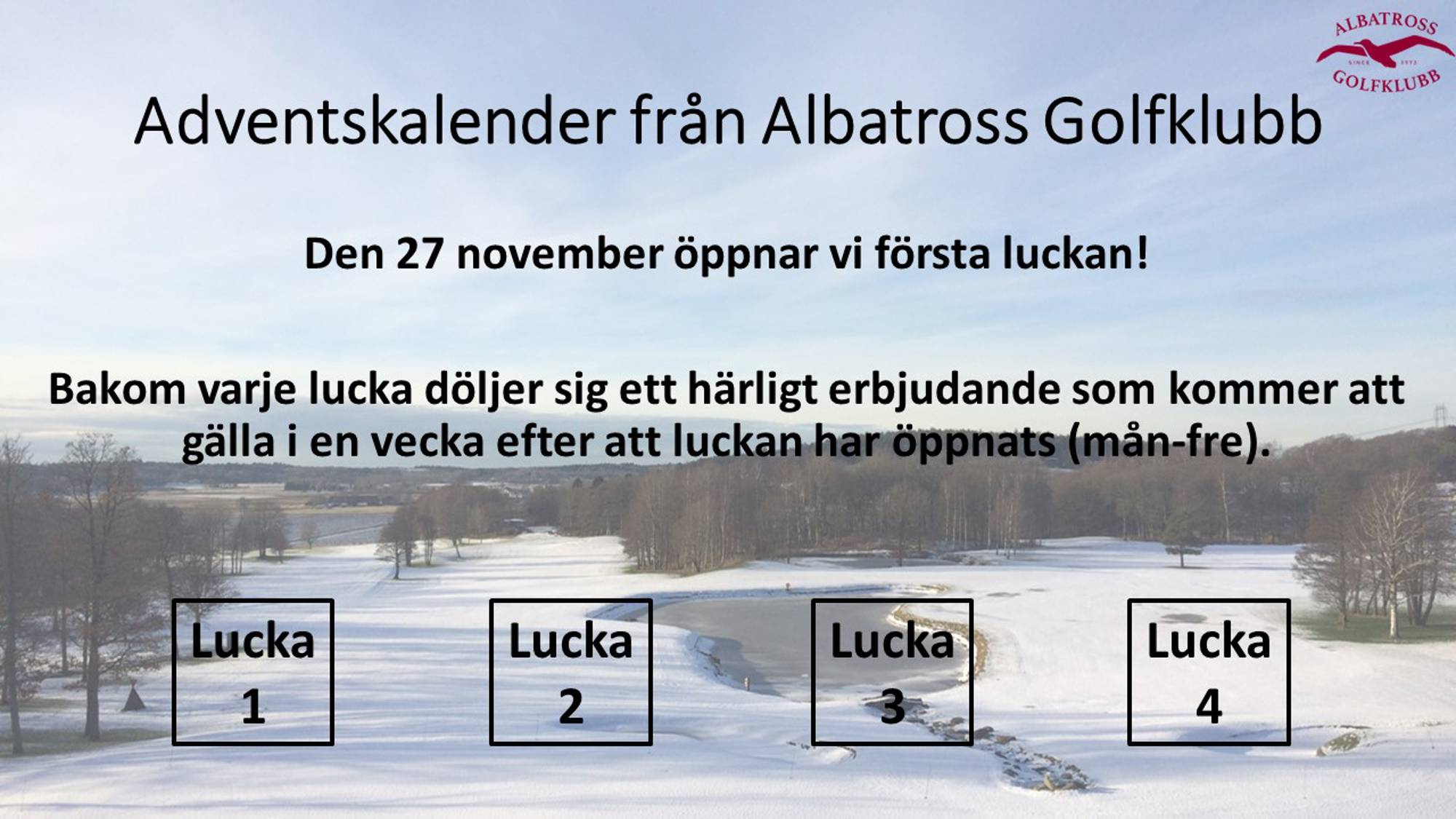 Första luckan kommer att öppnas den 27 november, bakom varje lucka finns ett fint erbjudande som gäller under veckan (mån-fre).